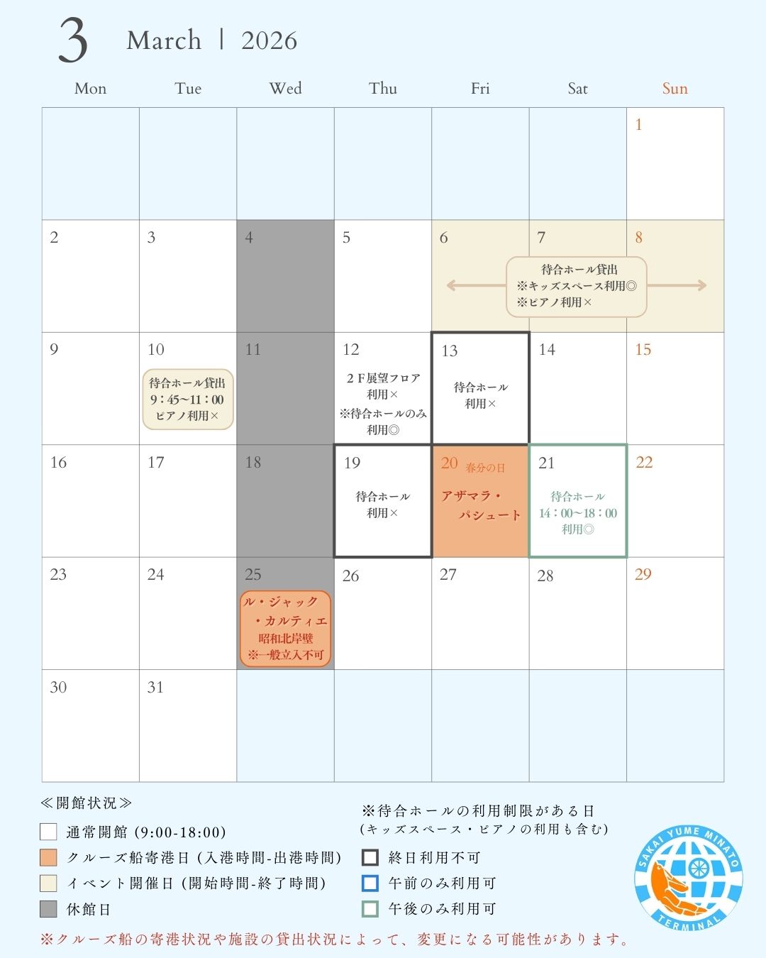 境夢みなとターミナル開館カレンダー【2026年3月】