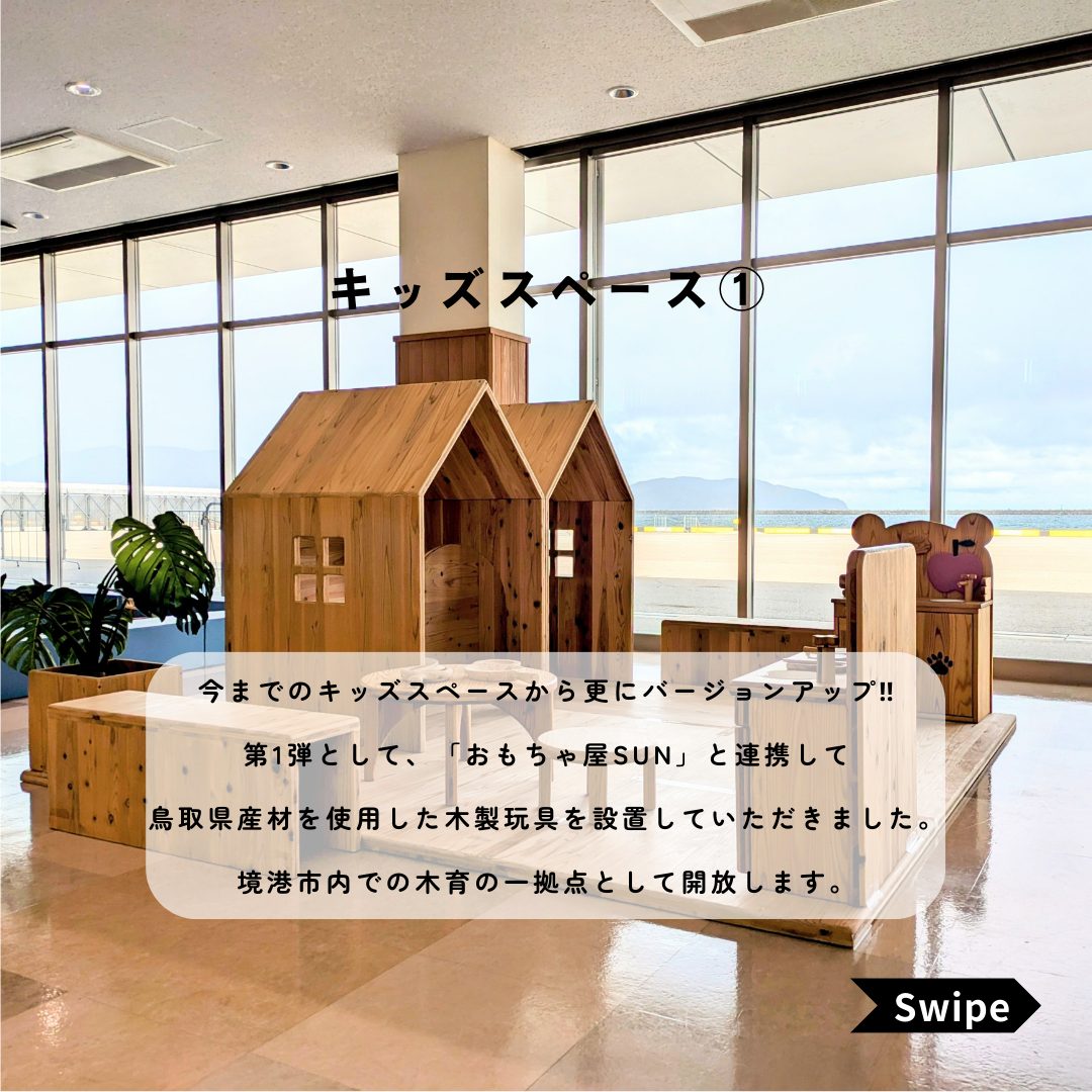第1弾として、米子市の「おもちゃ屋SUN」様と連携し、鳥取県産材を使用した木のおもちゃを設置していただきました。